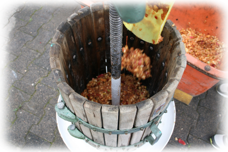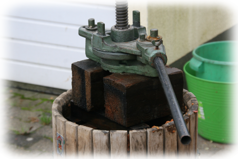 Hier wurde nun die "Maische" in einem sogenannten Kelter eingefüllt und gepresst.