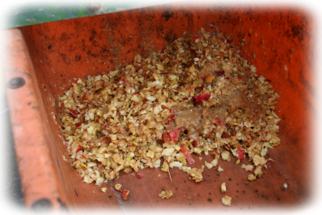 Um den Saft aus den Äpfeln pressen zu können, müssen diese mittels einer "Mühle?" zuerst zerkleinert, sprich zur "Maische" verarbeitet werden.